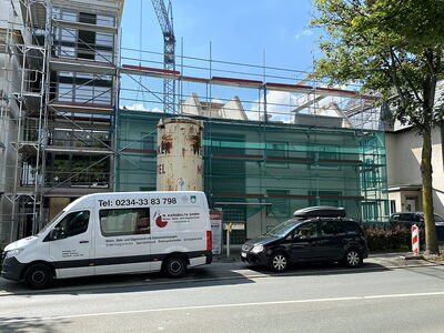 Im Zuge der Aufstockung dieses MFH wurde das gesamte Dachgeschoss, einschl. Spitzboden, Dachstuhl, Drempel, Gauben, Giebelwände, Kamine etc. entkernt und bis auf die Rohdecke des 1.OG rückgebaut, damit die Aufstockung erfolgen kann. Als erstes wurde die zuvor bewohnte Wohnung komplett entkernt. In Folge wurden alle nicht tragenden Wände abgebrochen, um auf der Decke des 1.OG eine Notabdichtung erstellen zu können (bauseits).