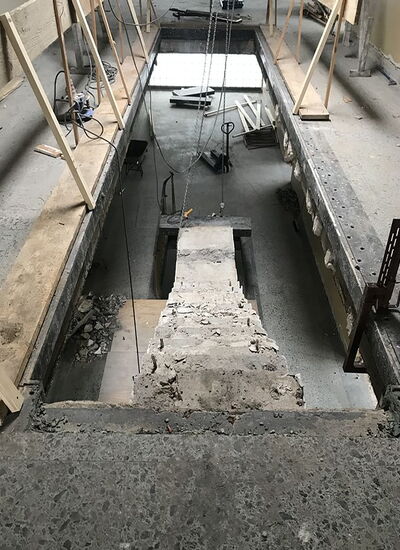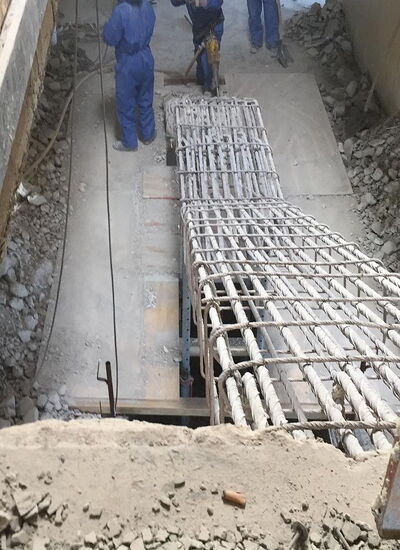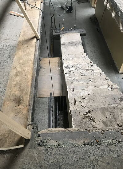 der Beton unter Erhalt der Bewehrung gestemmt und anschließend die Bewehrung mittel Brennschneider rückgebaut. Vorab wurden die Treppen bis hin zur Bodenplatte im Kriechkeller durchgestützt.