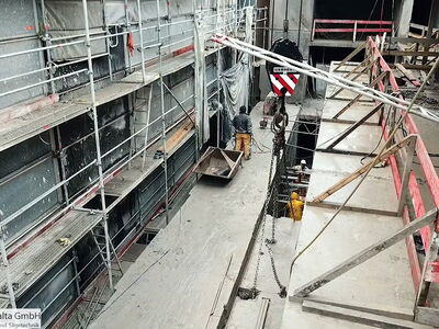 Da das Bauvorhaben strengen Schallschutzgenehmigungen unterlag, wurde durch uns ein Schallschutz-Fassadengerüst aufgebaut und vorgehalten. Des Weiteren haben wir das Gebäude im Zuge des Betonrückbaus gemäß der vorgegebenen Statik zusammen mit unserem Stahlbau-Nachunternehmer statisch ausgebaut. Alles aus einer Hand.
