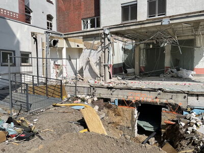 An folgendem Bauvorhaben wurde die Stahlbetondecke eines Tiefbunkers im Hinterhof eines Krankenhauses im erschütterungsarmen Diamantbohr- und Sägeverfahren rückgebaut.