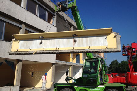 Demontage und Entsorgung der Betonvorhangfassade einer Schule in Dortmund (ca. 1000 m² Fassade) im Wandsäge- und Abbruchverfahren.