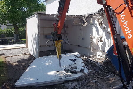 An diesem Einfamilienhaus wurde eine Fertigteilgarage mittels Abbruchagger abgebrochen.